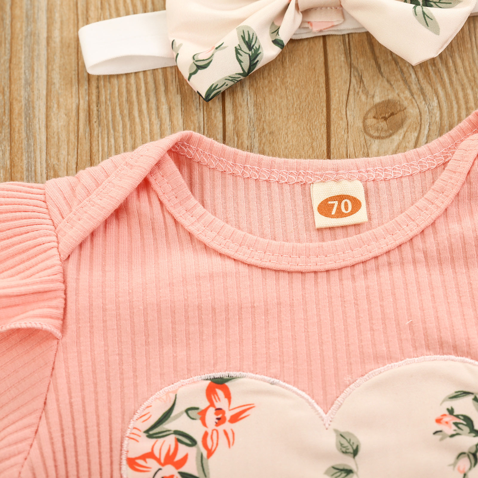 This outfit makes your baby girl even more beautiful. This is made of soft cotton fabric, with ruffled sleeve detail, a heart print on front, matching floral elastic shorts, and ribbons that make it more even prettier. It's very comfy and breathable.