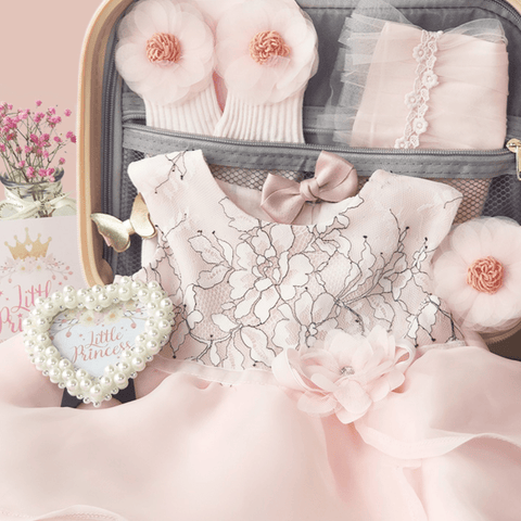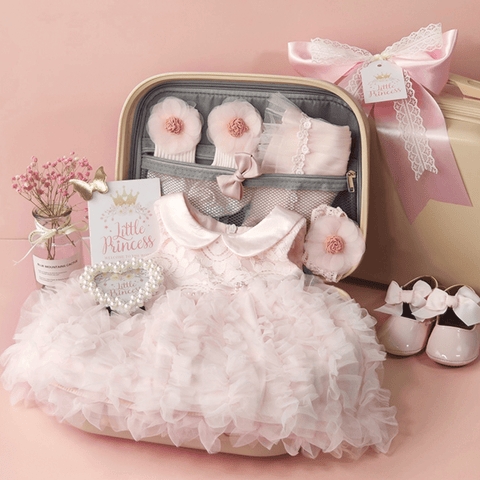 Hello, little princess! Here's a beautiful gift for you. This newborn baby gift set is perfect for all baby girls. It has all the essential pieces inside the multifunctional suitcase. In addition, it features a beautiful pink outfit/dress for the baby girl, socks, shoes, ponytails, and a cute photo frame. Sure to make your memories of your baby's first outfit most remarkable. Perfect for baby shower gifts to a newborn baby, birthdays, or any other special occasion. A must-have set for all little princesses!