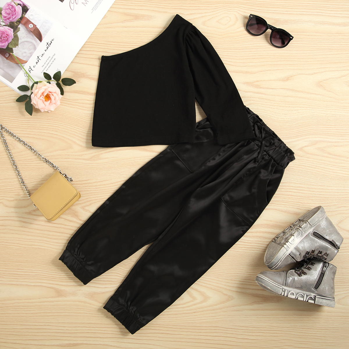Showcase this chic fashion outfit for your girls. Team a black off-shoulder top and coordinating elastic pants for a trendy vibe. Featuring a paper bag waist and front tie. Cut from soft and comfy fabric that suits your kids. A simple yet statement-making outfit for your girls!